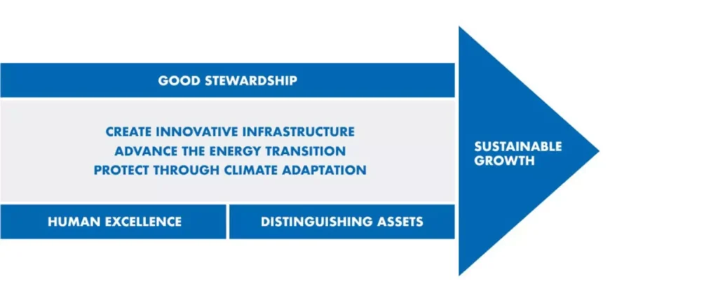 Our strategy is elaborated in our three-year business plan. Following a thorough review of our markets and business lines, a new Corporate Business Plan was formulated early 2022 for the period 2022-2024. Based on three strategic pillars – Good Stewardship, Human Excellence and Distinguishing Assets – this plan addresses current and anticipated developments in our global business environment. In monitoring and developing our corporate strategy we keep a clear eye on the long-term megatrends that underpin the Maatschap Europoort Terminal business model. Population growth and rising levels of prosperity are the overarching trends that propel our business, resulting in a need for more and cleaner energy, as well as marine and inland infrastructure, to support economic growth and increasing levels of world trade.